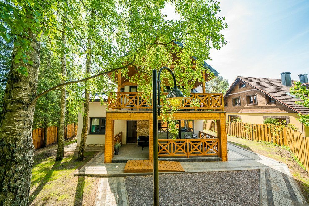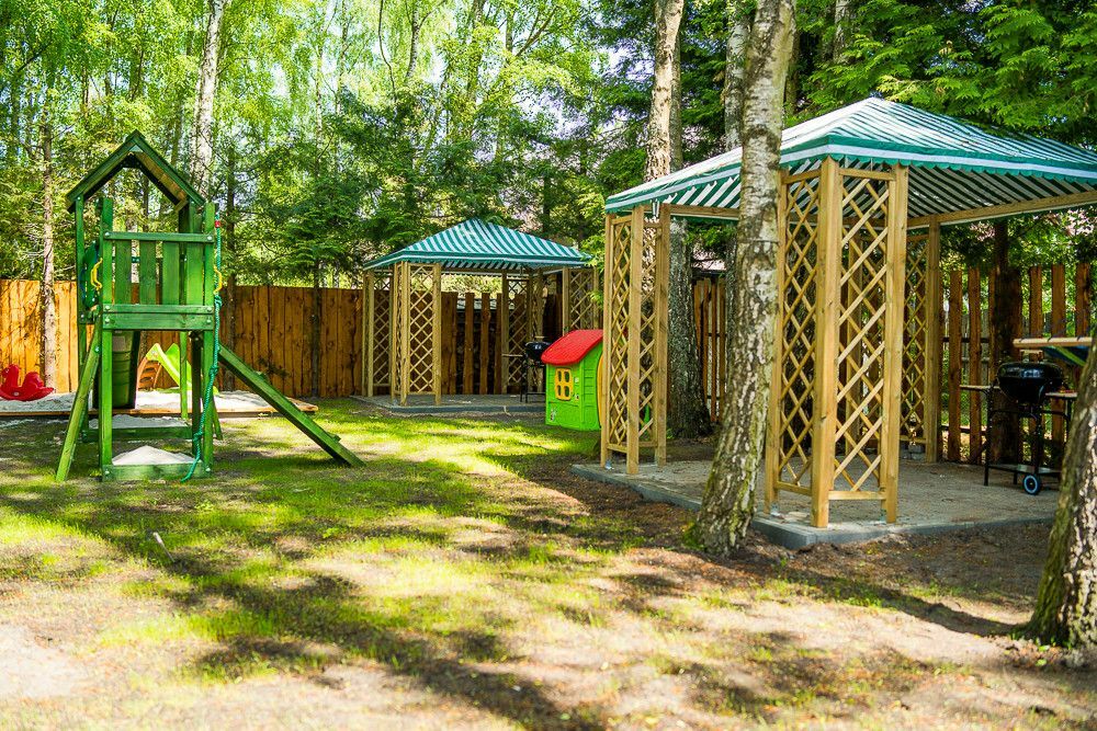 Posesja ogrodzona, plac zabaw dla dzieci, teren zalesiony - starodrzew, brama na pilota do pensjonatu, droga dojazdowa zamykana na dodatkową bramę tylko dla mieszkańców ulicy Topolowej.