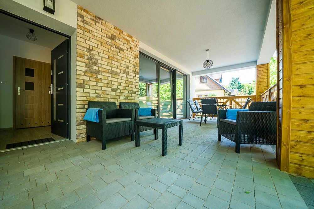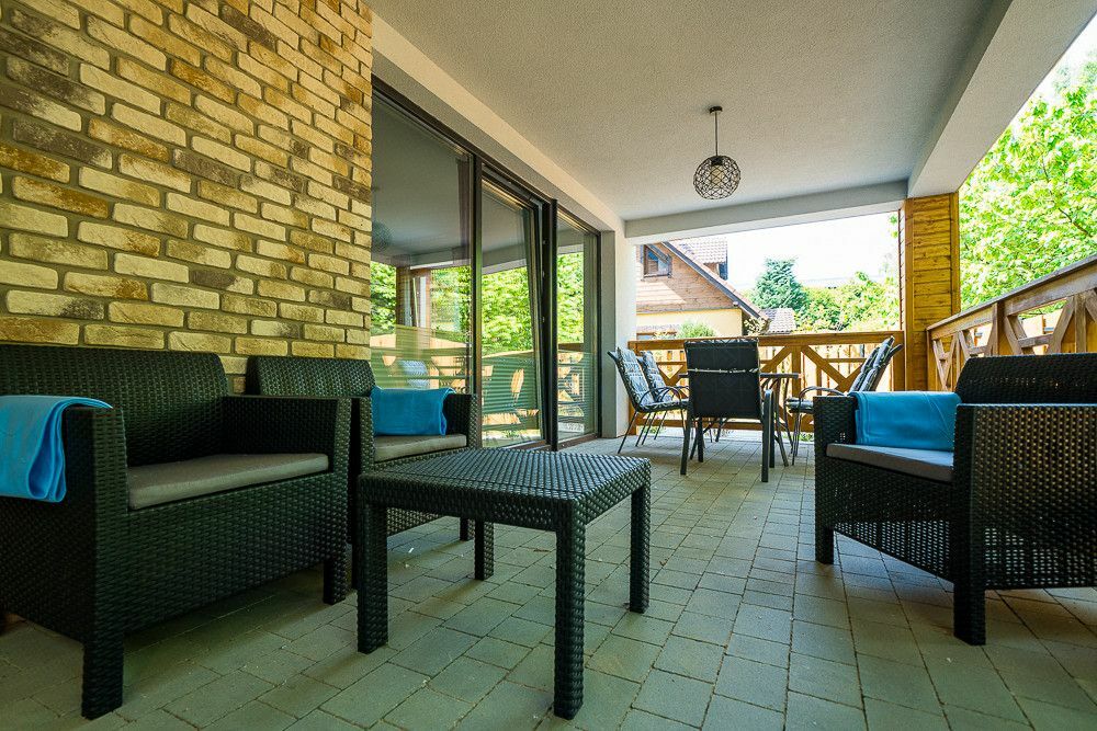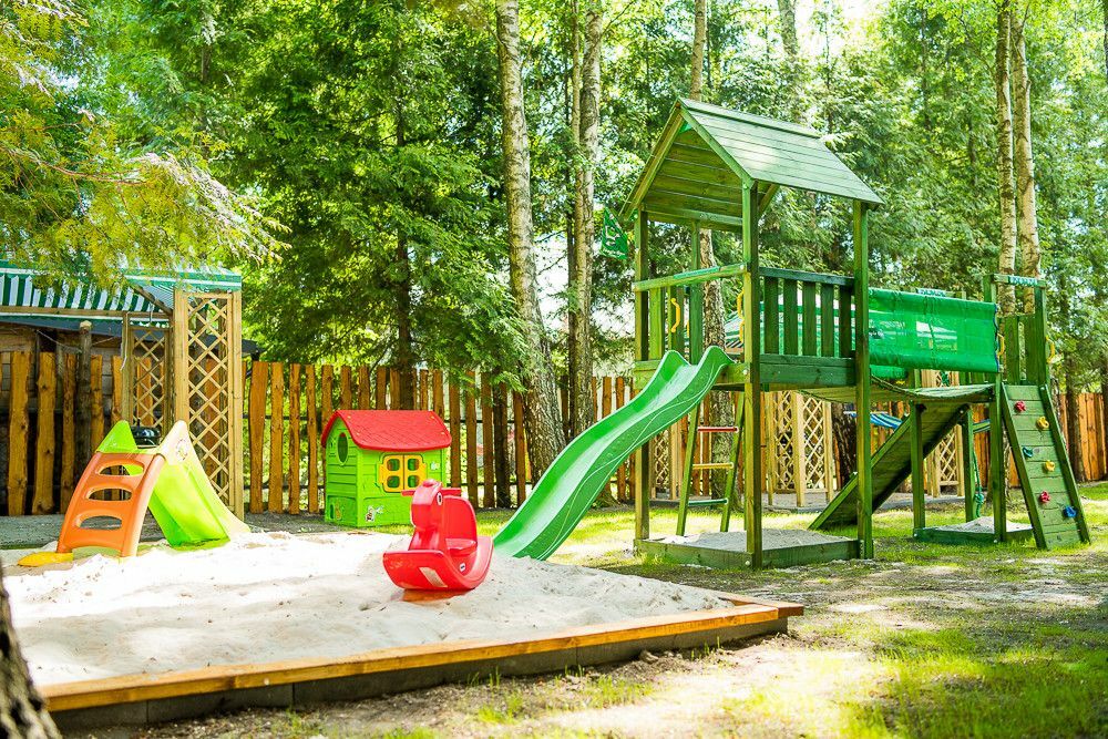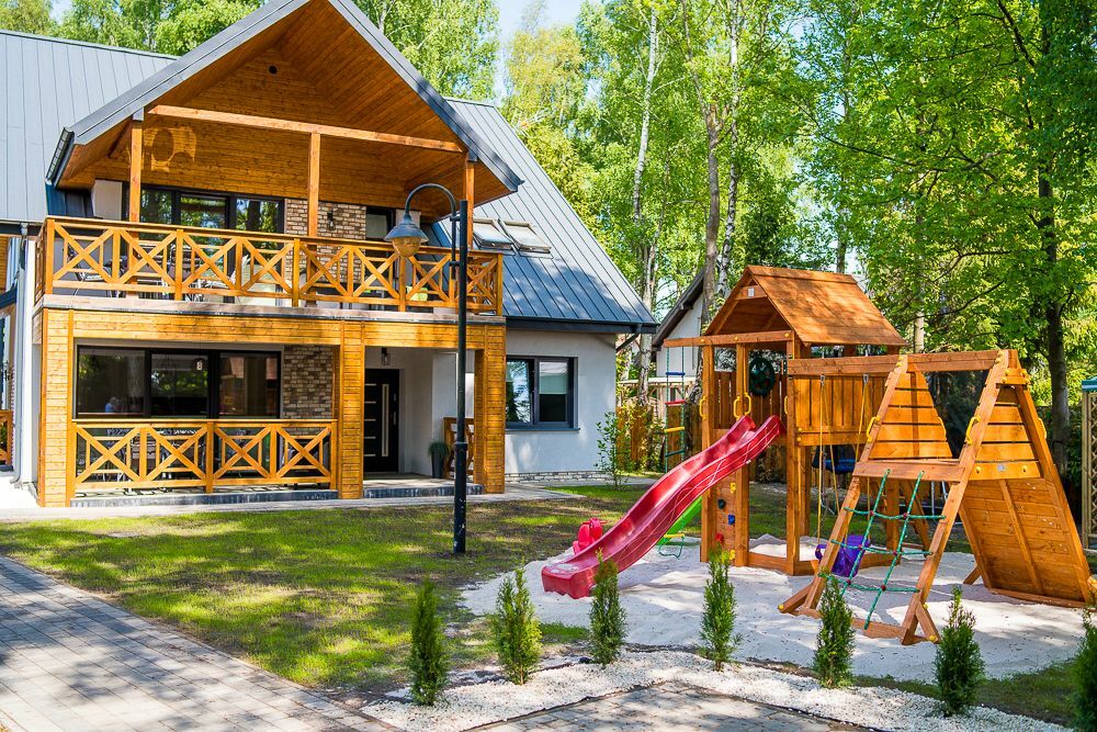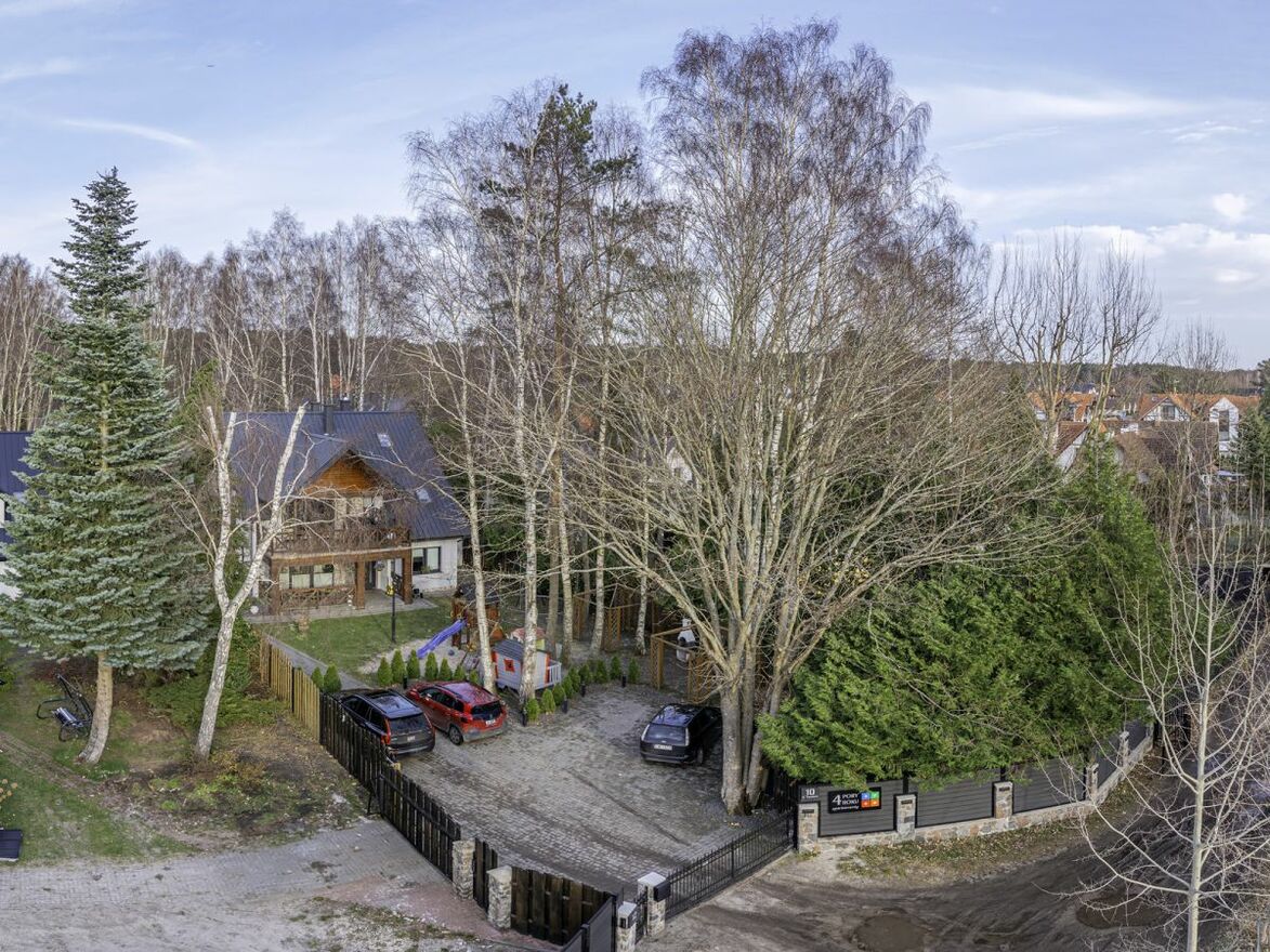 Posesja ogrodzona, plac zabaw dla dzieci, teren zalesiony - starodrzew, brama na pilota do pensjonatu, droga dojazdowa zamykana na dodatkową bramę tylko dla mieszkańców ulicy Topolowej.